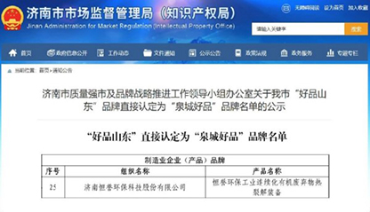 2024年7月公司主導(dǎo)產(chǎn)品“工業(yè)連續(xù)化有機廢棄物熱裂解裝備”入選濟南市市場監(jiān)督管理局認(rèn)定的第一批“泉城好品”;