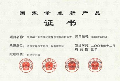2007年12月,公司《全自動(dòng)工業(yè)連續(xù)化廢橡膠裂解油化裝置》項(xiàng)目獲國(guó)家重點(diǎn)新產(chǎn)品獎(jiǎng)
