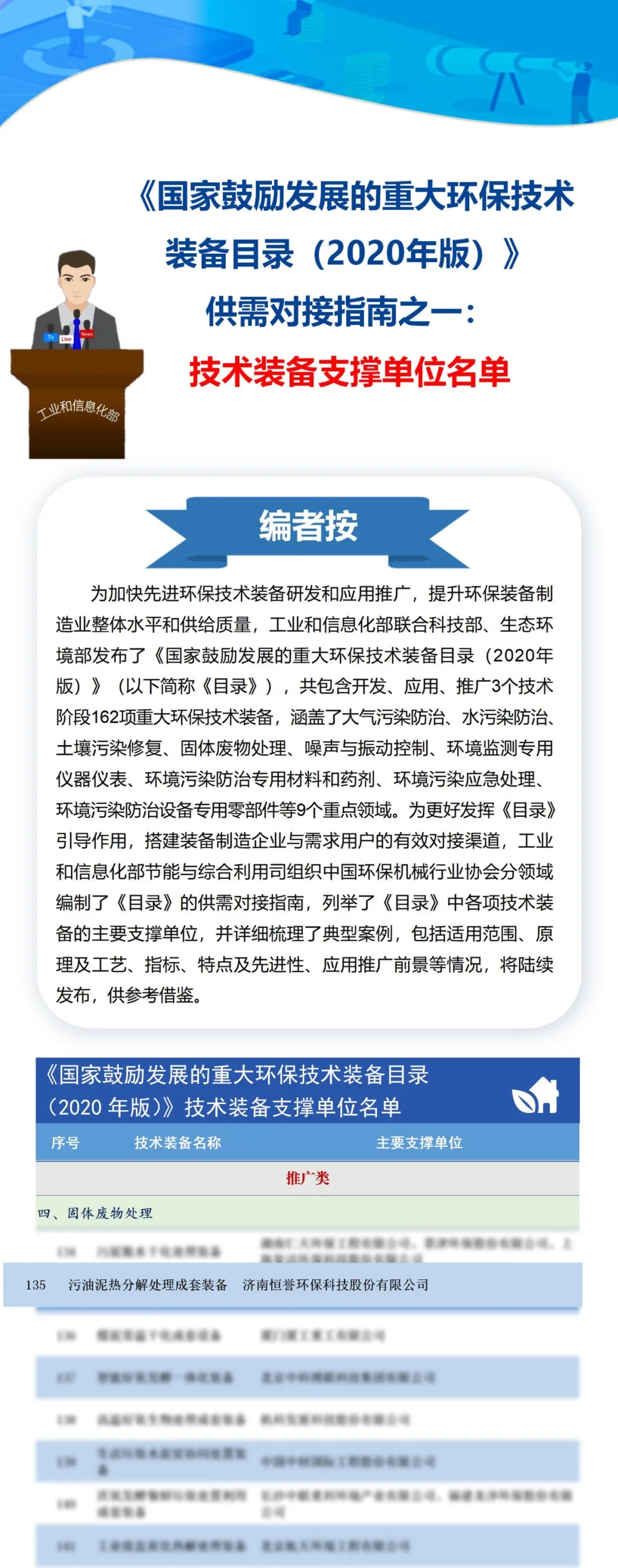 今日,工信部官網(wǎng)公示了《國家鼓勵發(fā)展的重大環(huán)保技術裝備目錄(2020 年版)》供需對接指南之一:技術裝備支撐單位名單,濟南恒譽環(huán)保科技股份有限公司成為國家鼓勵發(fā)展的重大環(huán)保技術裝備“污油泥熱分解處理成套裝備”技術裝備支撐單位。