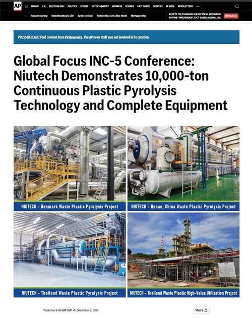 第五屆政府間塑料污染談判委員會(huì)(INC-5)在INC-5會(huì)議期間,美國(guó)最大的通訊社,將關(guān)注重點(diǎn)從會(huì)場(chǎng)內(nèi)轉(zhuǎn)向會(huì)場(chǎng)外,,并以“Niutech Demonstrates 10,000-ton Continuous Plastic Pyrolysis Technology and Complete Equipment”為題,報(bào)道了恒譽(yù)環(huán)保在丹麥、泰國(guó)、韓國(guó)及中國(guó)本土,持續(xù)穩(wěn)定運(yùn)行數(shù)年的多個(gè)。“全球廢塑料污染治理,離不開(kāi)先進(jìn)技術(shù)的支撐,其中來(lái)自中國(guó)的恒譽(yù)環(huán)保,,安全環(huán)保地將廢塑料變?yōu)樵偕Y源產(chǎn)品,減少了環(huán)境污染的同時(shí),為經(jīng)濟(jì)綠色發(fā)展做出貢獻(xiàn),為全球廢塑料污染治理提供了示范案例。